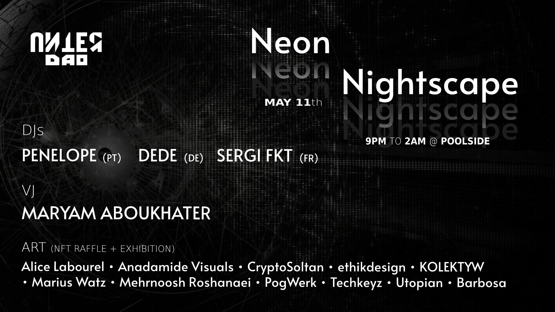 🎧 Get ready to dance to the beats of our amazing DJs: DEDE (PT), Penelope(PT), Serge SKT(FR) and mesmerized by VJ: Mauriam Aboukhater.